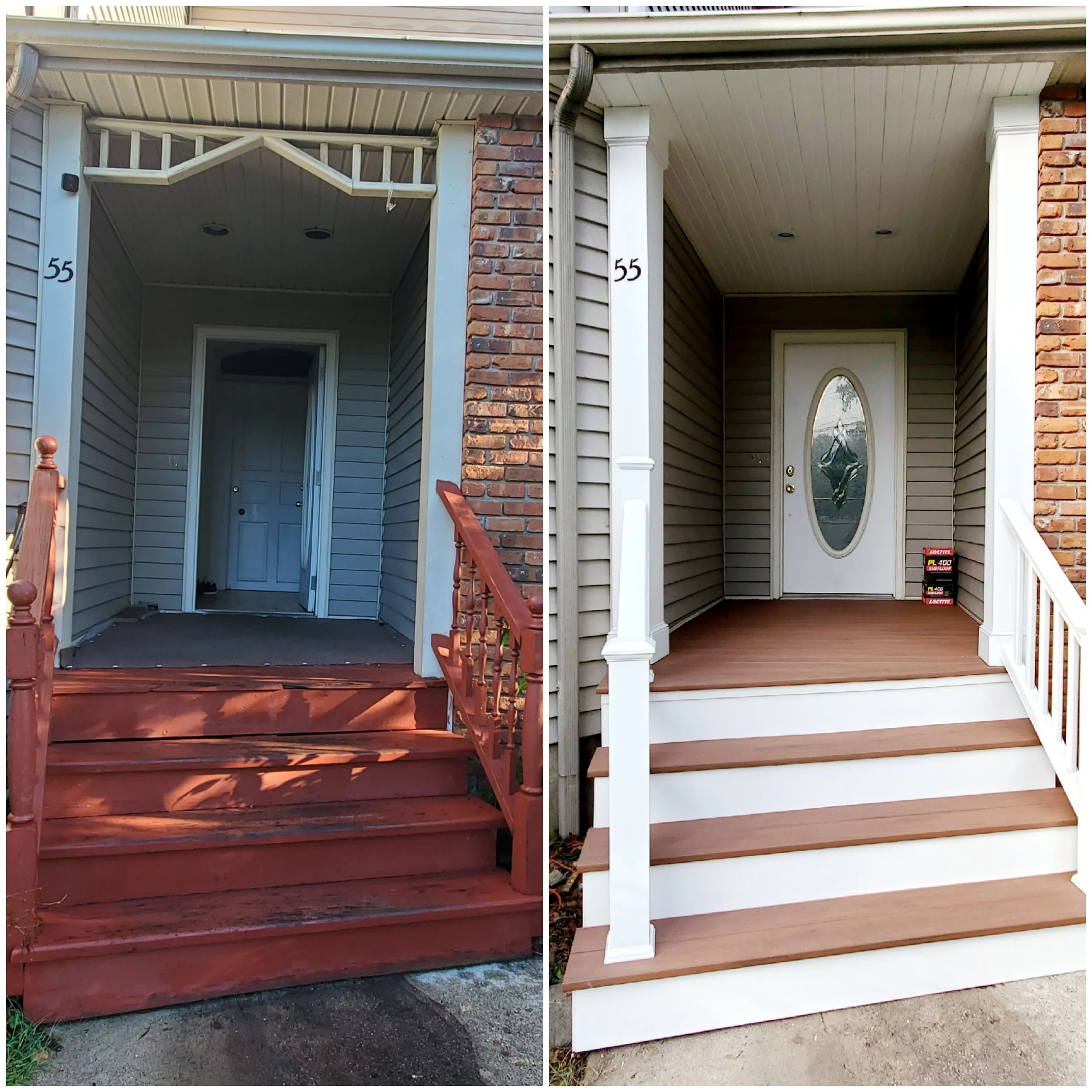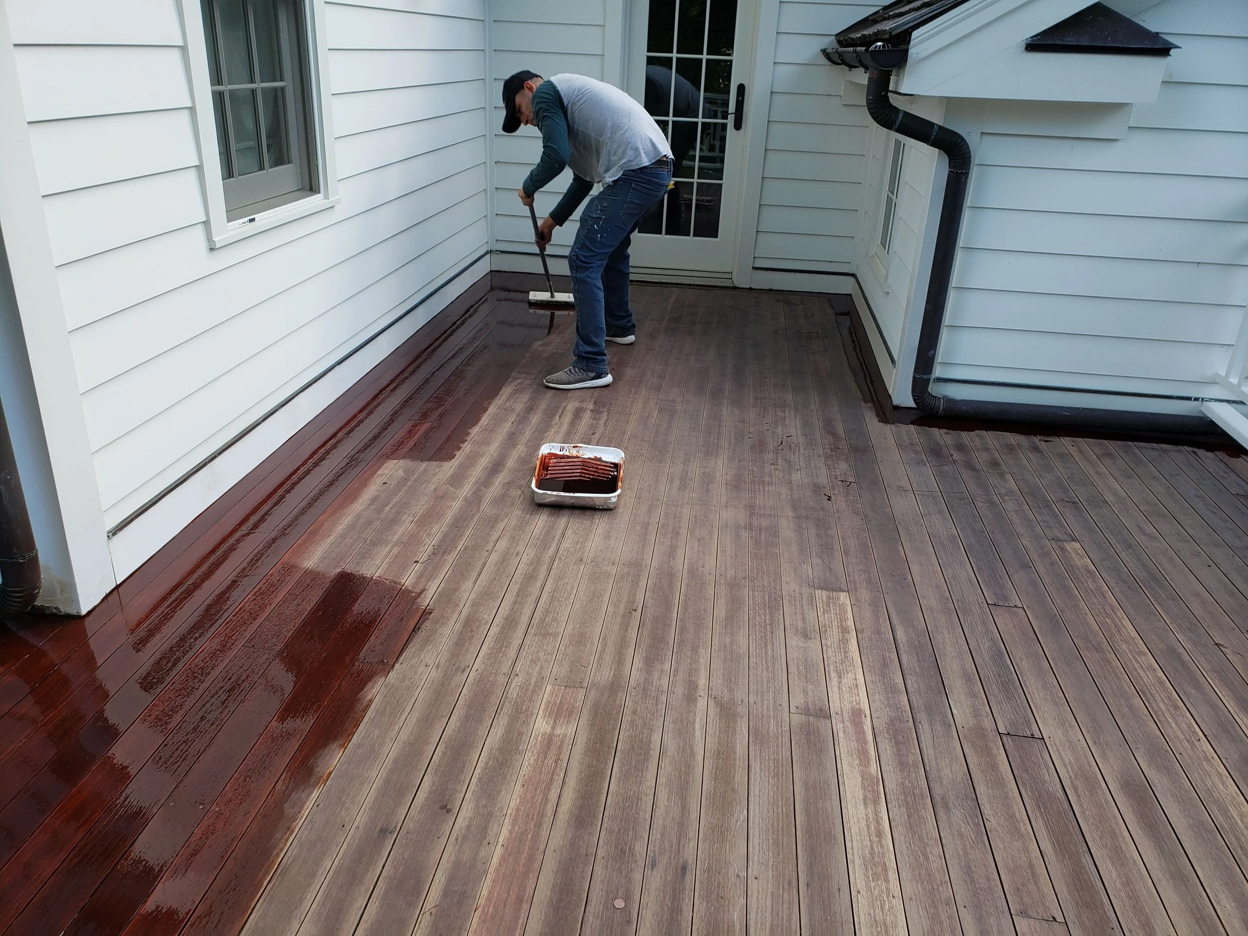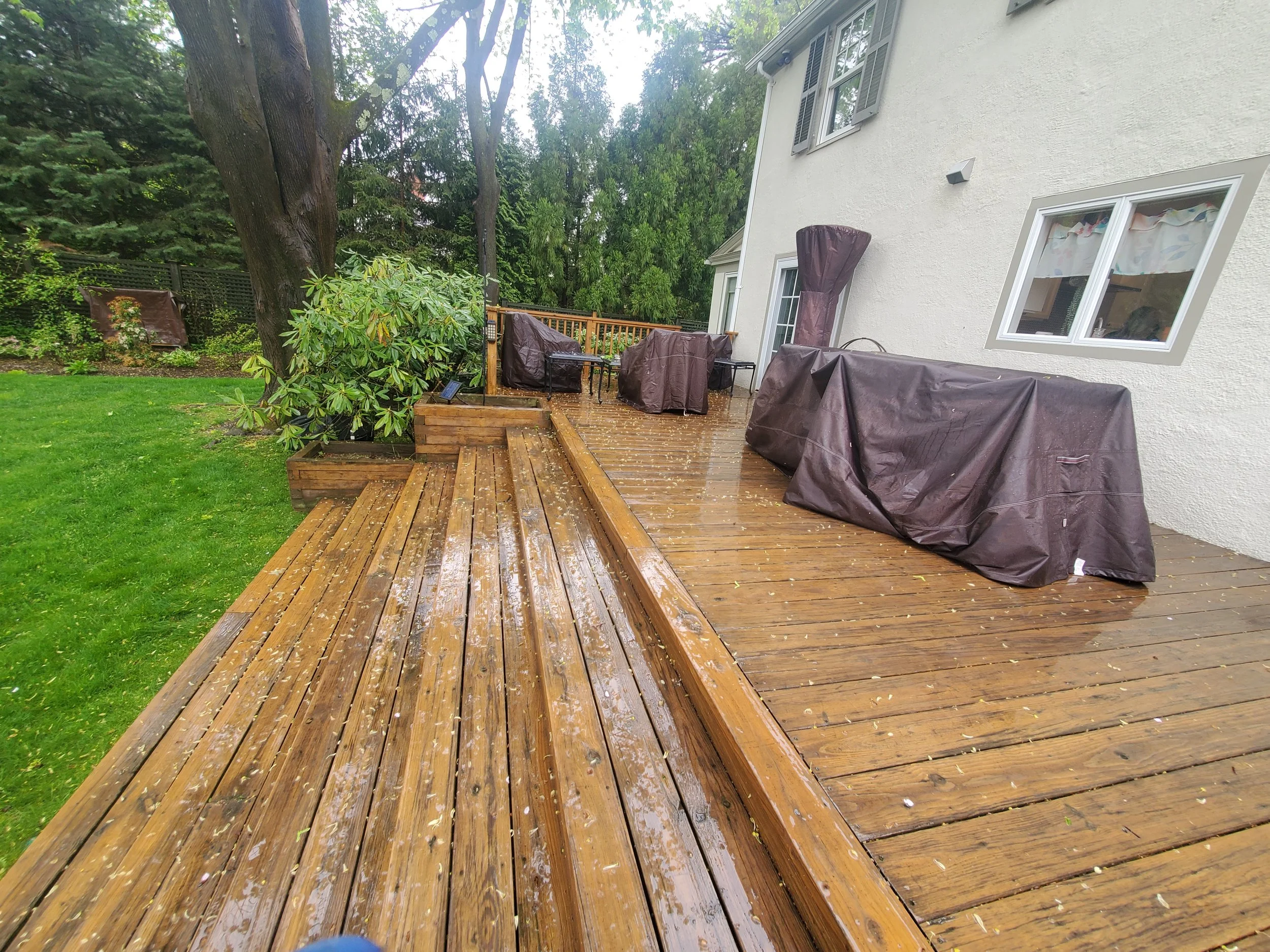 This client’s second-story wraparound deck hadn’t been refinished in several years, and was beginning to show signs of wear. After a thorough cleaning, we sanded the boards down to reveal the beautiful red mahogany underneath, which was in great condition. At our recommendation, the homeowner chose two coats of a clear satin finish to allow the natural color of the wood to shine.